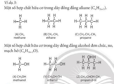 Thảo luận 6. Nhận xét đặc điểm cấu tạo (thành phần nguyên tử, số lượng nguyên tử của các nguyên tố, liên kết đơn, liên kết bội, nhóm chức) của các hợp chất hữu cơ trong hai nhóm chất ở ví dụ 3: nhóm 1(A, B, C) và nhóm 2 (X, Y, Z)