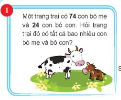 Tóm tắt: Bò mẹ: 74 con Bò con: 24 con Tất cả: ... con? | Bài giải Số con bò mẹ và bò con có tất cả là: 74 + 24 = 98 ( con) Đáp số: 98 con |