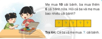 Trả lời: Cả ba và mẹ mua 10 + 6 = 16 cái bánh